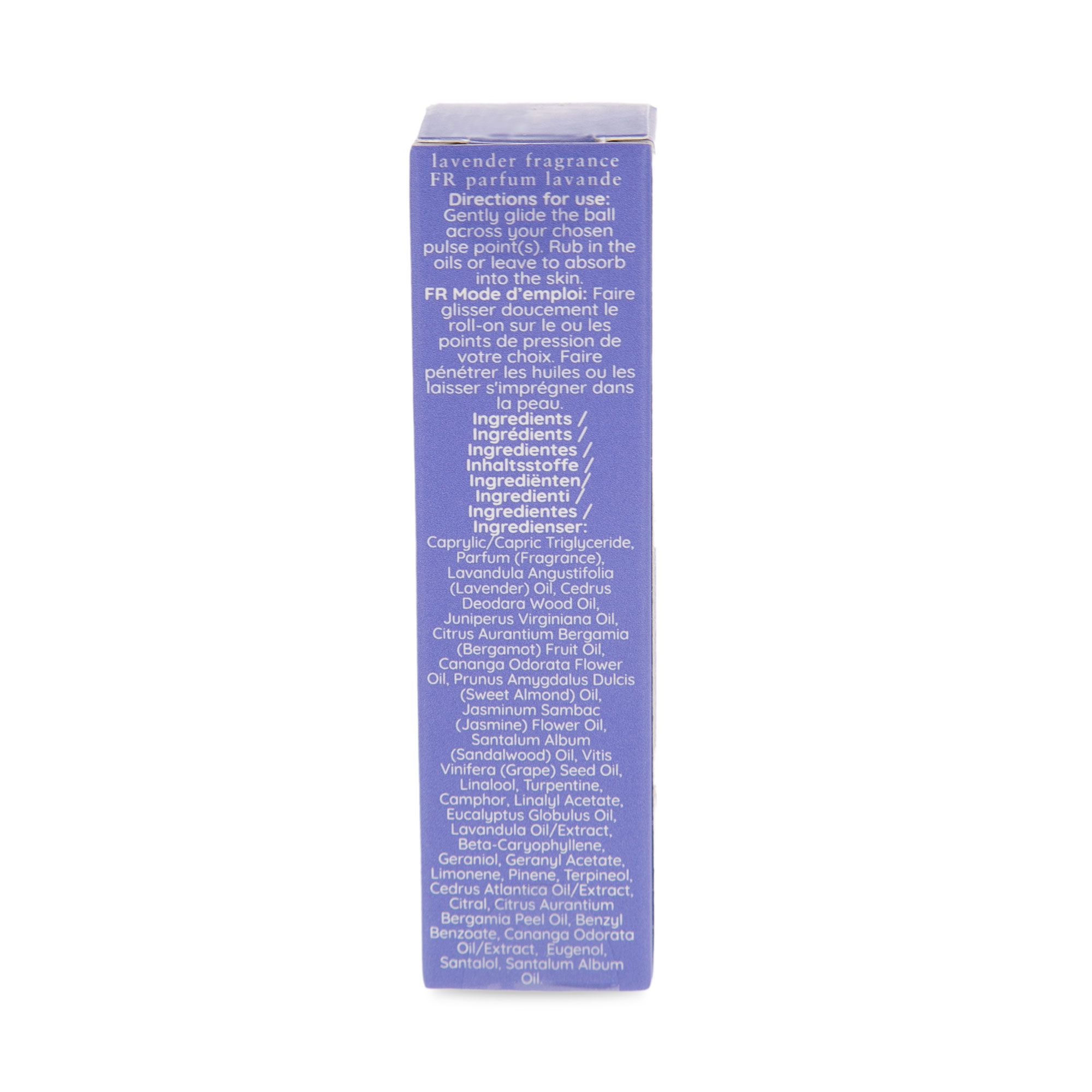 Ingredients Caprylic/Capric Triglyceride, Parfum (Fragrance), Lavandula Angustifolia (Lavender) Oil, Cedrus Deodara Wood Oil, Juniperus Virginiana Oil, Citrus Aurantium Bergamia (Bergamot) Fruit Oil, Cananga Odorata Flower Oil, Prunus Amygdalus Dulcis (Sweet Almond) Oil, Jasminum Sambac (Jasmine) Flower Oil, Santalum Album (Sandalwood) Oil, Vitis Vinifera (Grape) Seed Oil, Linalool, Turpentine, Camphor, Linalyl Acetate, Eucalyptus Globulus Oil, Lavandula Oil/Extract, Beta-Caryophyllene, Geraniol, Geranyl Acetate, Limonene, Pinene, Terpineol, Cedrus Atlantica Oil/Extract, Citral, Citrus Aurantium Bergamia Peel Oil, Benzyl Benzoate, Cananga Odorata Oil/Extract, Eugenol, Santalol, Santalum Album Oil. |