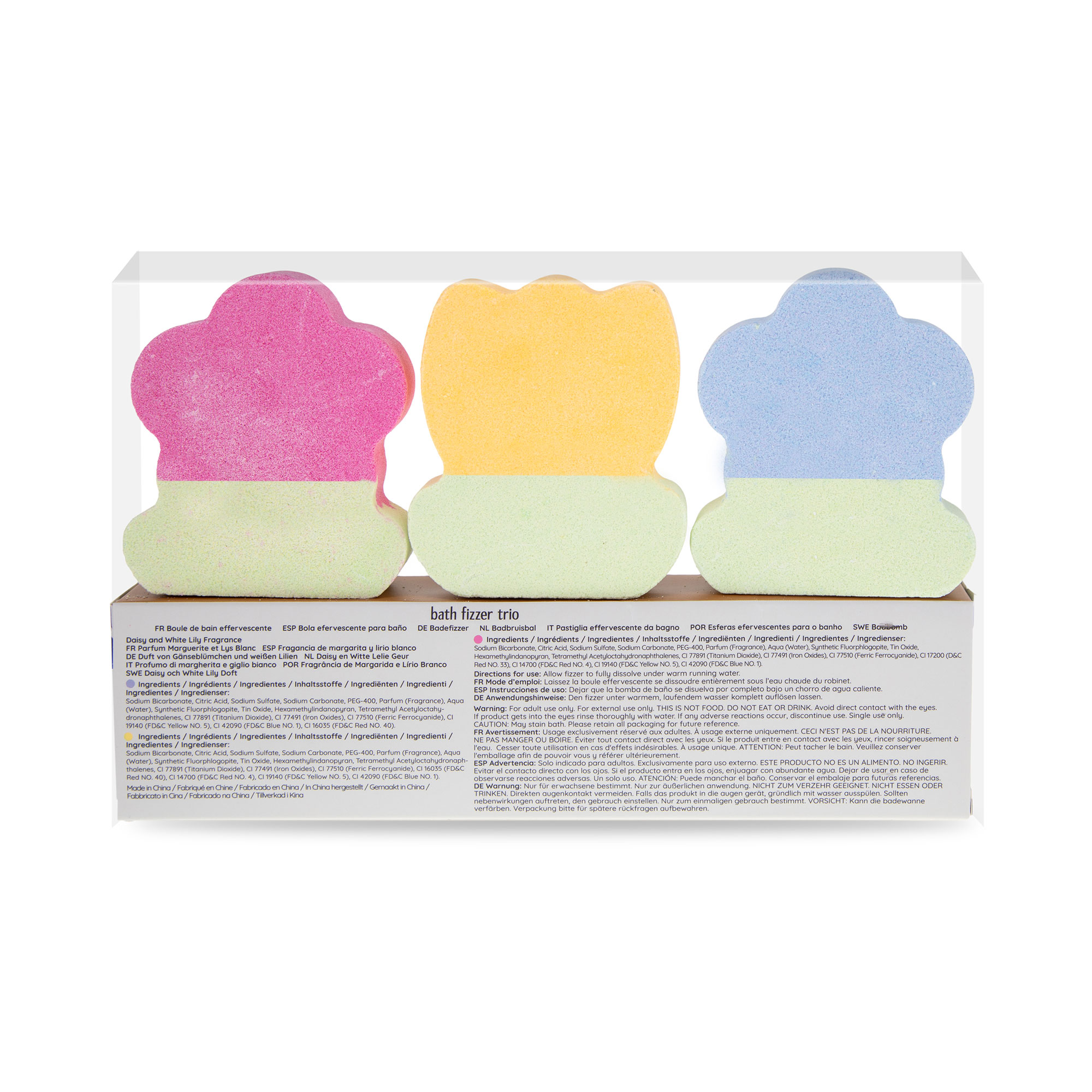 Ingredients Blue Fizzer: Sodium Bicarbonate, Citric Acid, Sodium Sulfate, Sodium Carbonate, PEG-400, Parfum (Fragrance), Aqua (Water), Synthetic Fluorphlogopite, Tin Oxide, Hexamethylindanopyran, Tetramethyl Acetyloctahydronaphthalenes, CI 77891 (Titanium Dioxide), CI 77491 (Iron Oxides), CI 77510 (Ferric Ferrocyanide), CI 19140 (FD&C Yellow NO. 5), CI 42090 (FD&C Blue NO. 1), CI 16035 (FD&C Red NO. 40). Yellow Fizzer: Sodium Bicarbonate, Citric Acid, Sodium Sulfate, Sodium Carbonate, PEG-400, Parfum (Fragrance), Aqua (Water), Synthetic Fluorphlogopite, Tin Oxide, Hexamethylindanopyran, Tetramethyl Acetyloctahydronaphthalenes, CI 77891 (Titanium Dioxide), CI 77491 (Iron Oxides), CI 77510 (Ferric Ferrocyanide), CI 16035 (FD&C Red NO. 40), CI 14700 (FD&C Red NO. 4), CI 19140 (FD&C Yellow NO. 5), CI 42090 (FD&C Blue NO. 1). Pink Fizzer: Sodium Bicarbonate, Citric Acid, Sodium Sulfate, Sodium Carbonate, PEG-400, Parfum (Fragrance), Aqua (Water), Synthetic Fluorphlogopite, Tin Oxide, Hexamethylindanopyran, Tetramethyl Acetyloctahydronaphthalenes, CI 77891 (Titanium Dioxide), CI 77491 (Iron Oxides), CI 77510 (Ferric Ferrocyanide), CI 17200 (D&C Red NO. 33), CI 14700 (FD&C Red NO. 4), CI 19140 (FD&C Yellow NO. 5), CI 42090 (FD&C Blue NO. 1). |